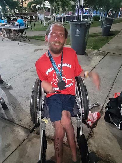 “I don’t think anything can slow Chris down,” says his mother Beverly, “he’s also competed in 3 Spartan Races with the group Special Compass out of Florida.  They put him in a special harness and piggy back him over obstacles.”