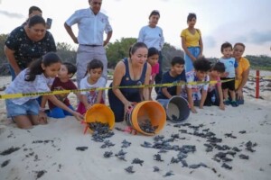Cozumel’s Mayor Juanita Alonso Marrufo attended the release of 200 baby sea turtles, last Wednesday. These are the first hatchlings released after Category 2 Hurricane Beryl passed by Cozumel.