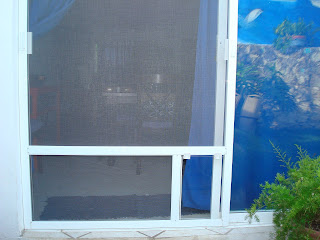 We also got the large screen on our sliding glass door repaired. Our “cat” (who is convinced he’s the third dog) took it upon himself to create his own cat door, basically by head-butting the screen until the corner ripped. We knew it was time to get it fixed when a three-year old child could also walk through. We had the screen team in, and showed them what the cat had done, and showed them the damage, explaining that we wanted a cat door in the left corner. We were thrilled when they returned at the end of the day, with this elaborate set-up featuring a clear plastic cat door, until we installed it and realized that the cat door is now on the right corner, so unless the door is fully open, it’s useless.