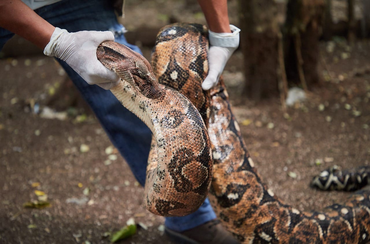 Boa constrictors prey on small mammals, birds, and reptiles, putting native and even endemic species — like the Cozumel dwarf raccoon and coati — at risk of population decline.