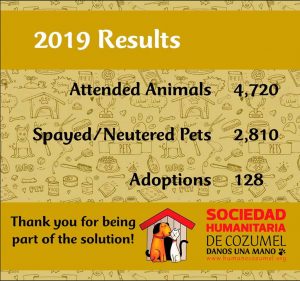 The staff and board members of the Humane Society of Cozumel Island would like to wish all of our supporters a Happy New Year. Take a look at how many dogs and cats we were able to assist in 2019 thanks your support. (see box). We look forward to 2020 with great