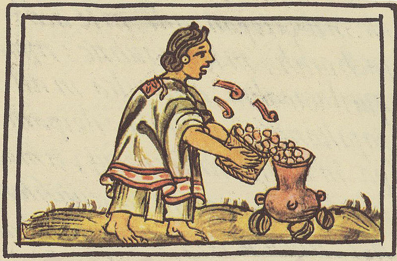 In his famous writings Historia General de las Cosas de Nueva España [General History of the Things of New Spain] (16th century), Franciscan missionary and Spanish historian Bernardino de Sahagún shared his amazement at seeing the Aztecs roast corn kernels over a fire and watch them open up like flowers, which they referred to as momochtli or momoxtli (“little piece of heaven”) and the “popping kernels” as totopoca. In the myths of the ancient civilizations of America, especially the Aztecs and Mayans, “popping corn” was an important part of creation and was used not only as food and decoration, but also for offerings and rituals dedicated to gods such as Tlaloc and Chaac because “it resembles hail… every kernel is a very white flower” (Sahagún). The Spanish missionary narrates that maidens danced adorned with headbands and necklaces made of popcorn, and popcorn was even used in ceremonial headdresses. Popcorn was revered as a sacred gift. Among the Maya, it was a symbol of abundance, prosperity, and spirituality, representing the connection with the Earth and the gods.